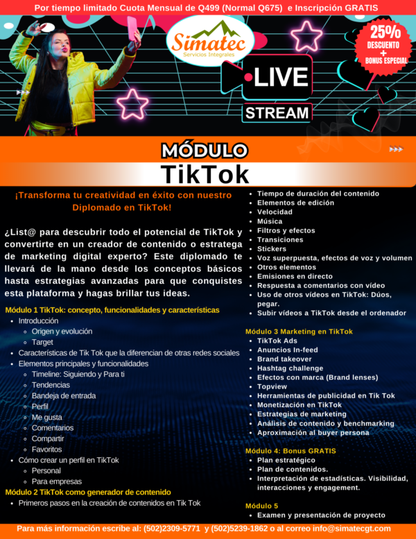 📣 Diplomado ☑️ TikTok Ads + Email Marketing 🚀💌 (2 meses – 1 clase por semana) – PROMOCIÓN ESPECIAL 25% de Descuento – 2 Mensualidades de Q499 (Precio Normal Q675 cada mensualidad)